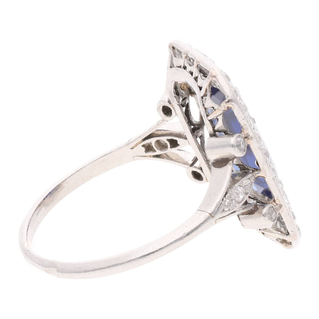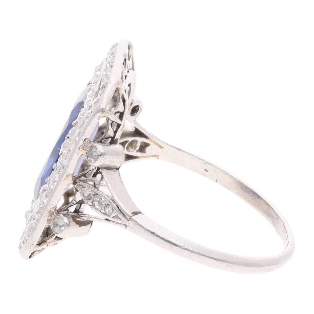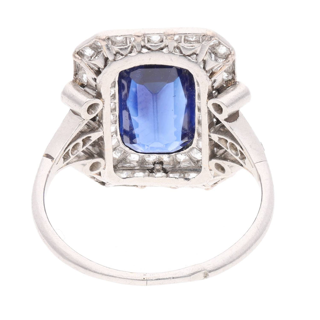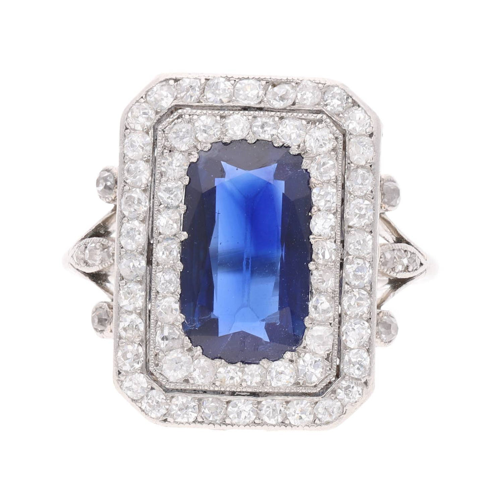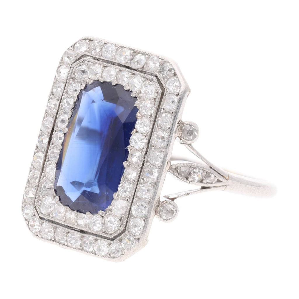 - A striking Art Deco ring featuring a richly coloured sapphire in a bold rectangular setting, surrounded by a finely set border of sparkling diamonds. Finished with elegant geometric details and milgrain edges, this piece captures the timeless glamour of the 1920s.
