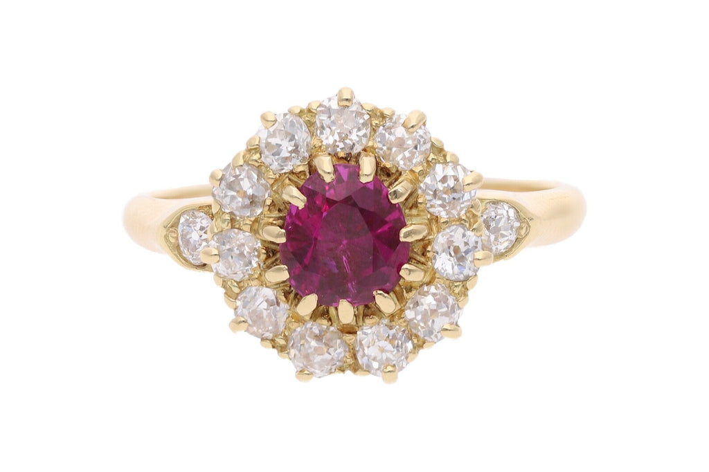 A 18ct yellow gold set cluster ring, with oval cut ruby surrounded by 11 old cut diamonds and a diamond on each shoulders.